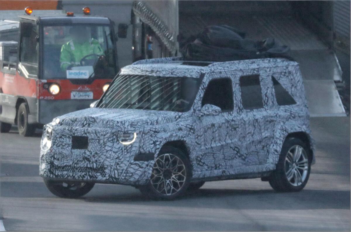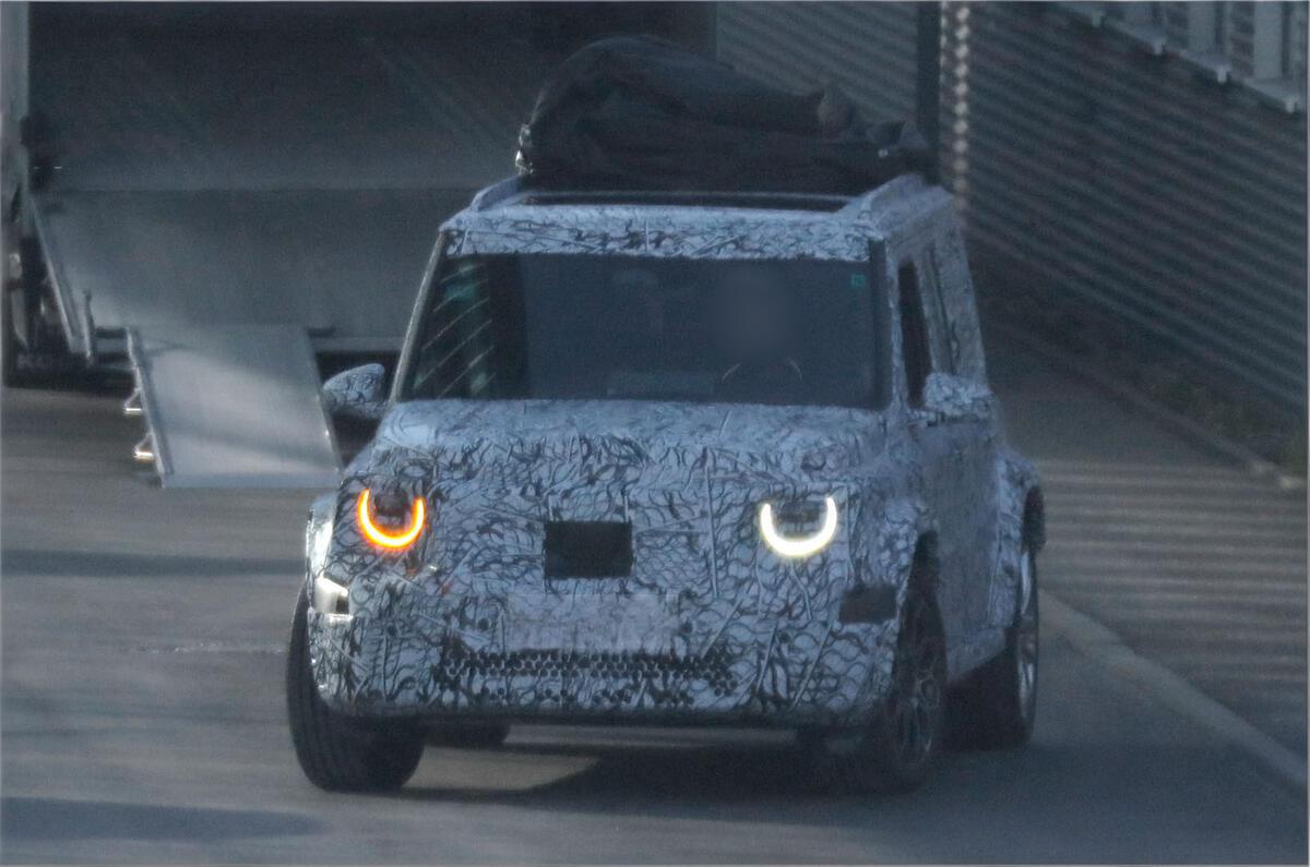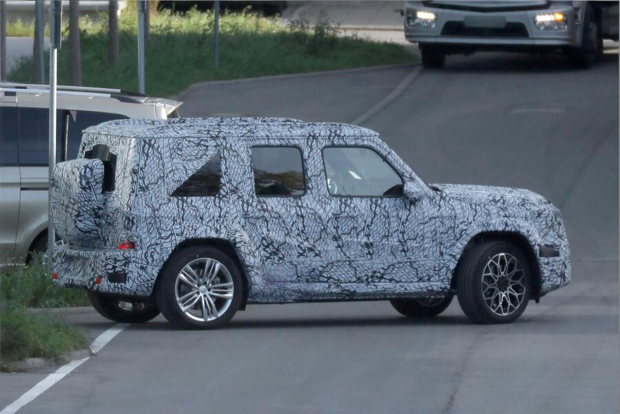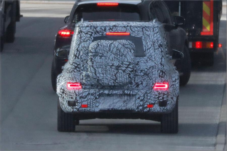 近日海外媒体首次捕获到"小G级"的路试谍照。尽管车身覆盖厚重伪装,但仍可看出其延续了G系列经典的方盒子造型,保留了三窗设计和外挂备胎等标志性元素。不过新车高度明显降低,预计低于1.718米,较现款G级(1.969米)更为低趴,整体尺寸缩小约20%。