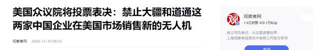 观察者网2024-12-10《美国众议院将投票表决:禁止大疆和道通这两家中国企业在美国市场销售新的无人机》
