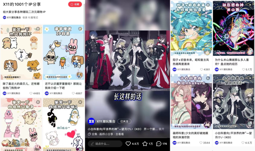如X11在小红书上发起的「X11的1001个IP分享」,发帖盘点了诸多狗狗IP、兔子IP、猫咪IP,包括已被开发与未被开发的,可以根据评论中用户的反馈热烈程度选择下一个具有爆款潜力的IP。