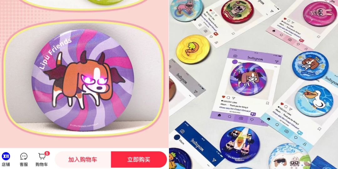此外,一些设计上的小巧思,也能够放大IP魅力。比如暹罗厘普IP里的小动物中有一只比格小狗,X11在推出常规的徽章品类时,将比格小狗的眼睛处加上了两个小灯泡,使其成为「电眼小狗」,在常规品类中做出差异化。