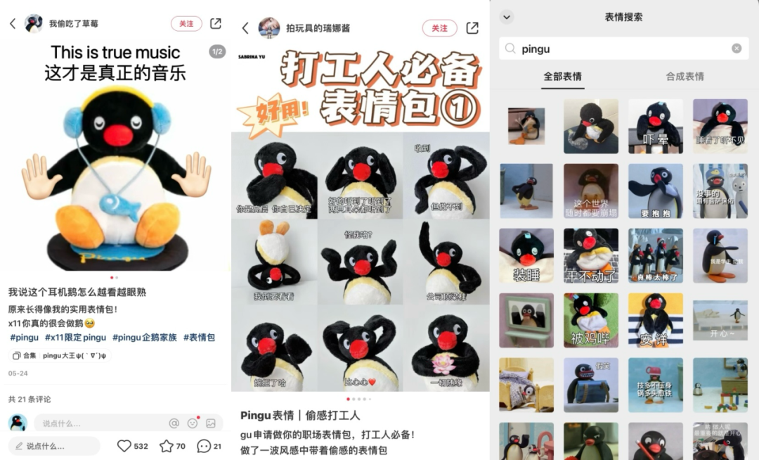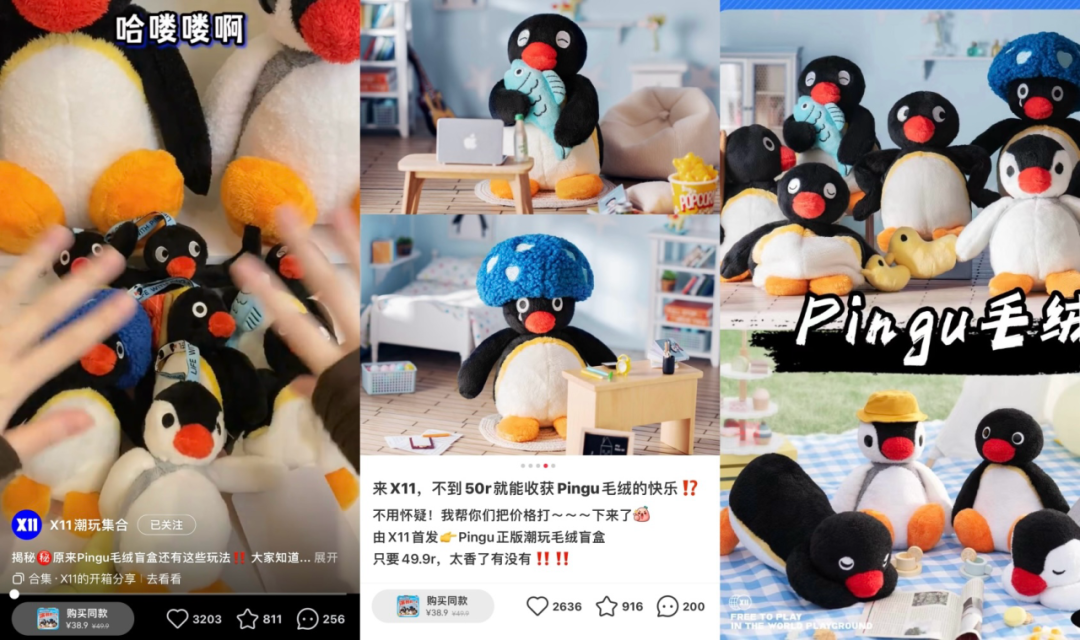 比如X11的Pingu毛绒系列以及盲盒系列,便推出了许多原创的,让当下年轻人更有代入感的动作与表情,在主动运营与用户自发二创下,将这些毛绒盲盒产品的照片成为表情包的新素材。