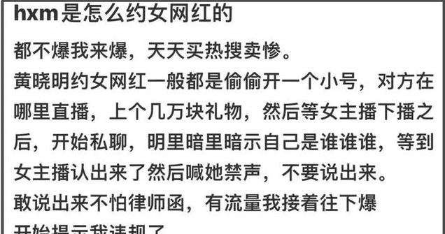 爆料称,黄晓明约网红惯用小号,先在直播间狂刷礼物,引起女网红注意,然后私聊暗示身份,并要求对方保密。