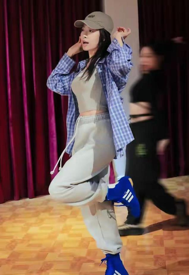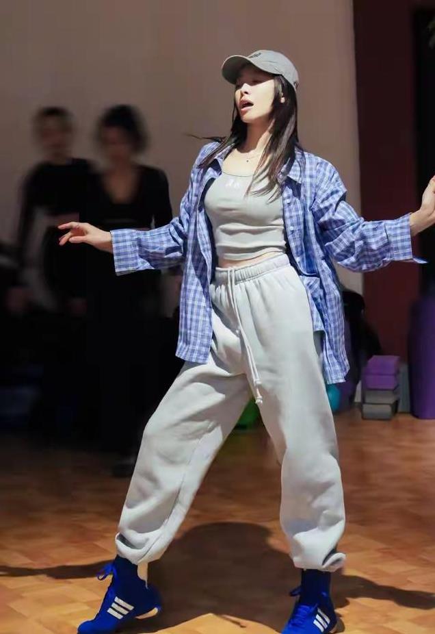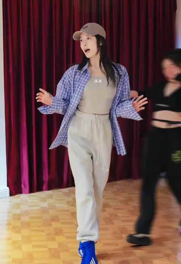宋茜跳街舞的模样,真的太显年轻了。穿紧身衣、阔腿裤,一点都不像37岁的年纪。她披一件蓝白格子的衬衫,特别有少女感。