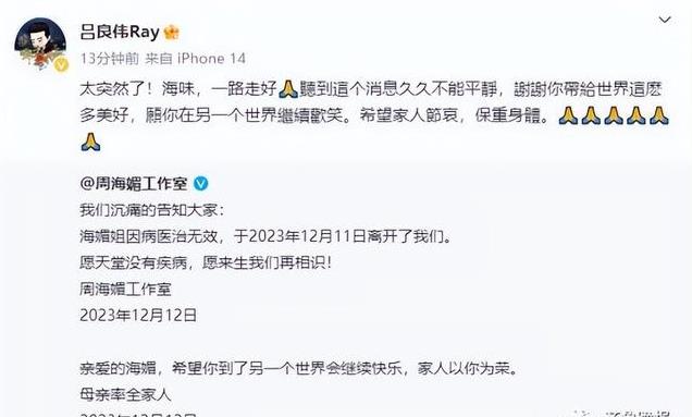 周海媚去世后,她的前男友吕良伟在社交媒体上发文悼念,因为文章中把“海媚”误写成了“海味”,网友们都纷纷提出了质疑。