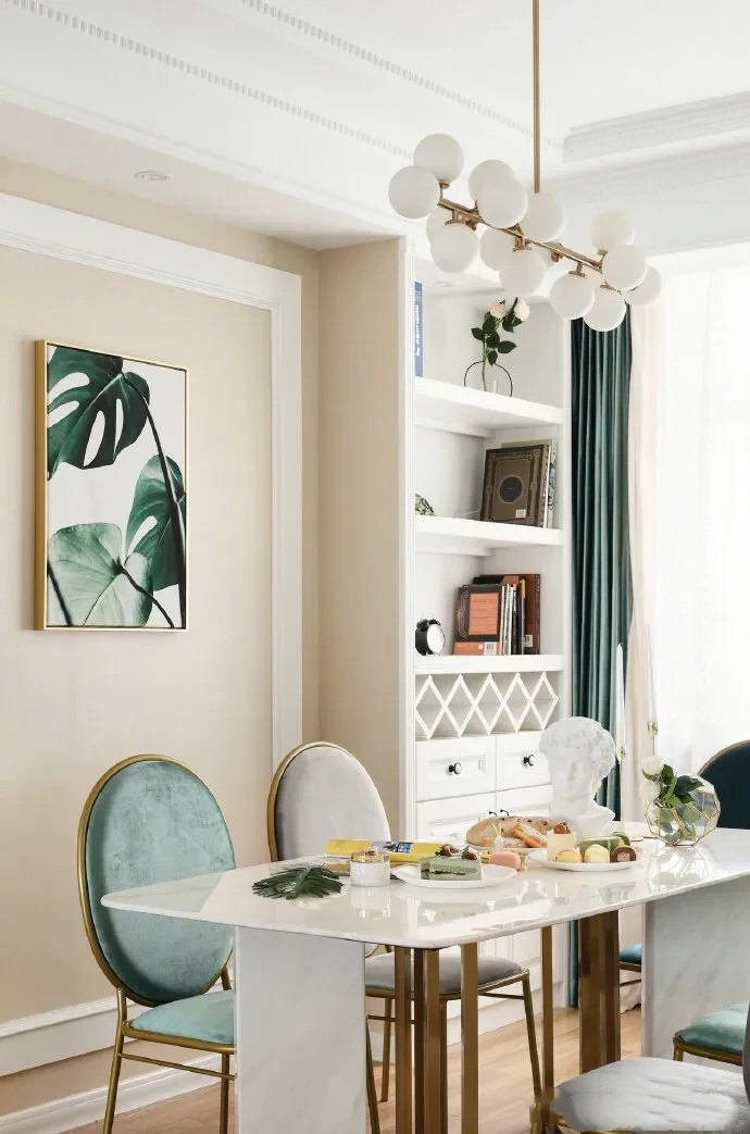 色彩上的搭配以自然为主,清新又舒适的感觉,都是浅色系的色调搭配,除了窗帘的墨绿色,这样的搭配很有时尚感。