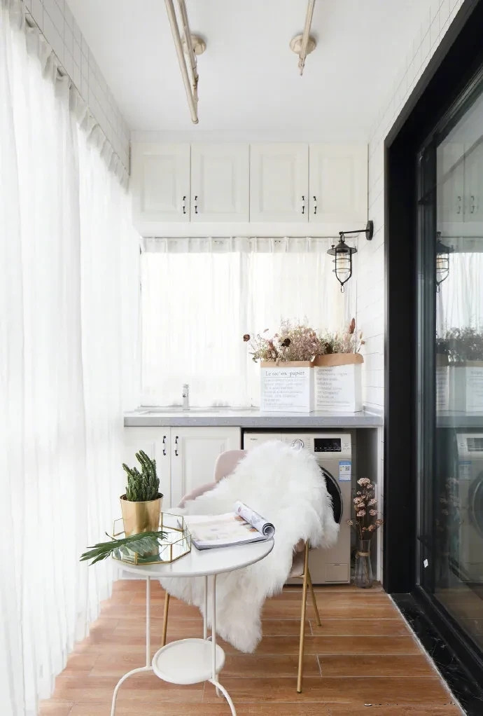 阳台是客厅的阳台,本身采光非常好,而且空间比较大,做了定制的洗衣柜之外,还在中间的区域摆放上了休闲座椅,周末的时候可以在阳台上看书写字或者是工作,十分的惬意。