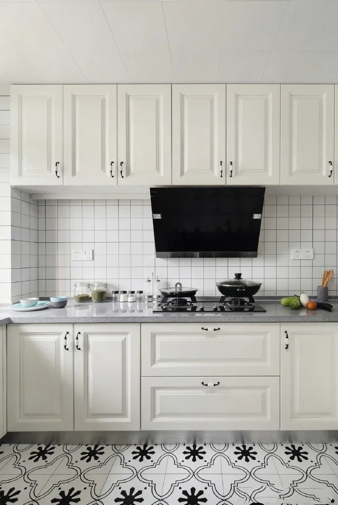 厨房,整体上都是做了定制柜的设计,这样的柜子可以满足日常的收纳空间,充分利用了厨房的空间,墙面做了白色的格子瓷砖装饰,整体效果让人更喜欢,时尚清新又大气。