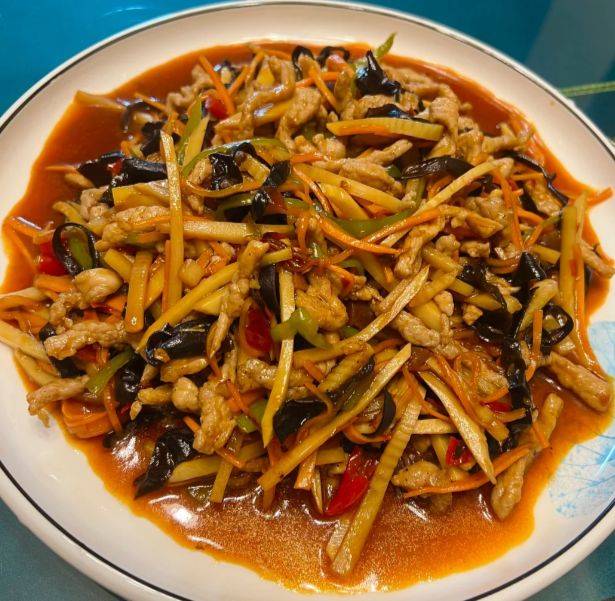 这时候,最关键的一步来了——调味。不同于川味的糖醋口,湖南鱼香肉丝的酱汁是用生抽、少许老抽、陈醋和一点点盐调成,不加糖或者只加极少的一点糖提鲜,突出的是咸鲜酸辣的本味。将酱汁沿锅边淋入,快速翻炒均匀,让每一根肉丝和每一片蔬菜都裹上浓郁的酱色。出锅前,可以勾一点薄芡,让汤汁更好地附着在食材上。
