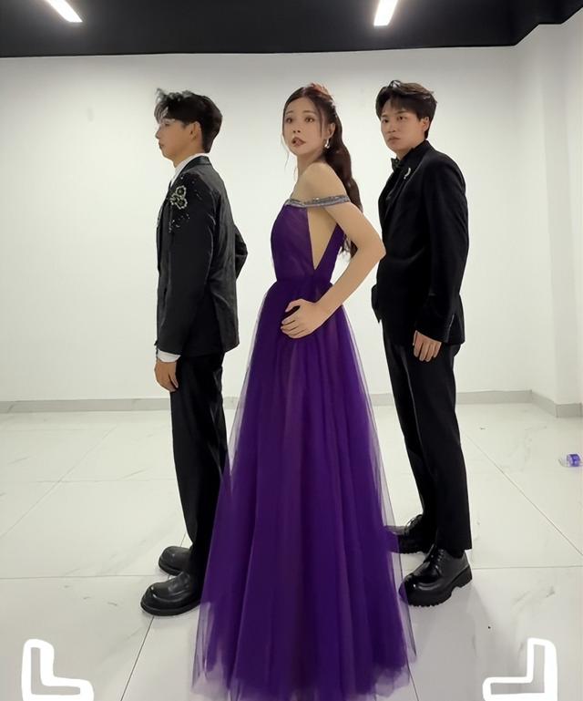 她一身紫色长裙,跟着其他艺人一起跳了一段舞蹈。