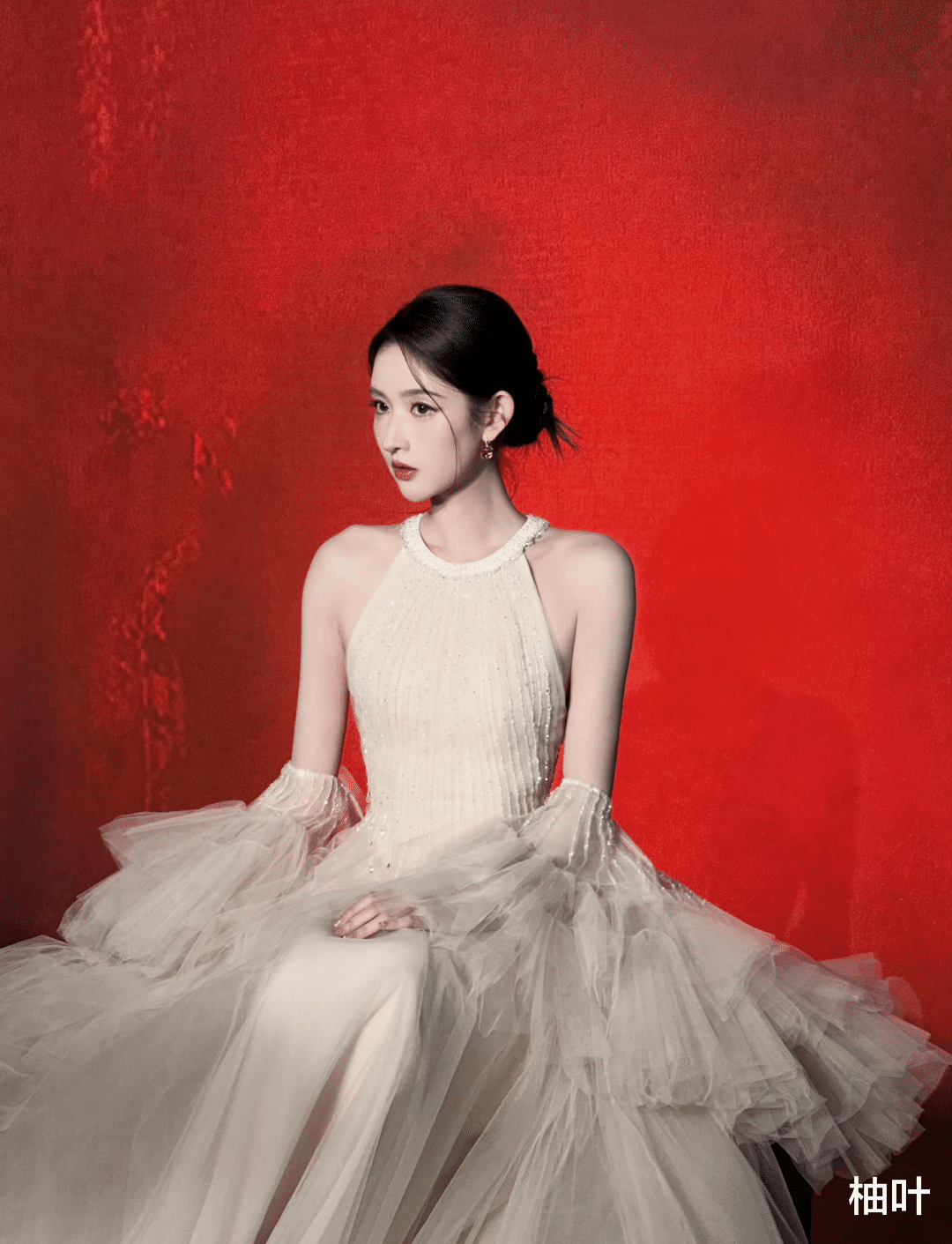 轻纱的裙摆,随着她的走动轻轻飘动,就像云朵在跳舞,又像仙女在施展魔法。她每走一步,都仿佛自带BGM,美得让人移不开眼。而且这礼服的细节处理也超棒,珍珠耳饰点缀在发间,和红唇相互呼应,既优雅又不失俏皮,就像从漫画里走出来的公主一样。