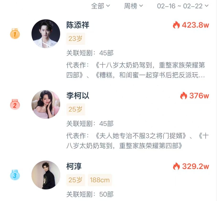 在第三方统计平台的演员个人热度值榜单上,更给人一种“城头变幻大王旗”的感觉,演员的排位与爆剧的出现有直接关系,一旦演员作品数量变少或作品不够爆,就会迅速在榜单上滑落。这或许也是短剧演员总是停不下来,总要不停进组开工的原因。