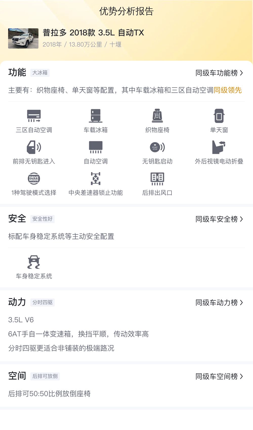 具体车辆信息,这台普拉多2018款3.5L自动TX,属于中配车型,外观白色,内饰深色,2018年10月首次上牌,期间过户2次,表显里程13.80万公里,国V排放标准,新车指导价45.08万,目前二手车报价31.88万,目前该车在湖北十堰出售。