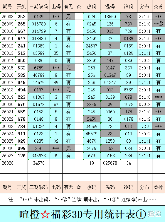 26028期:暄橙福彩3D综合条件(本期将在1月28日21:15开)一、上期回顾 ☆1、上期开奖号:1 2 6。2、和值= 9,跨度= 5。3、常态组六,012路组合。4、热度分布(热:温:冷)1:1:1。二、本期条件 ☆1、三期缺码:34578。2、热:19,温:025678,冷:34。3、断组分解式:0459//123-678。4、四胆:3459;三胆:349。三、术语解释 ☆1、三期缺码:0至9这十个自然数当中,未在近三期开奖号出现的数字。2、热度(热温冷):自然数0至9,在近七期开奖号中,出现3次及3次以上的数字,称为热码;出现2次的数字,称为温码;出现1次和未出现的数字,称为冷码。某个数字在开奖号中出现几个,就按几次计算。3、断组分解式:将0至9这十个自然数,分成三组数字,从前往后依次为A组(4码)、B组(3码)、C组(3码),一般情况下,有一组数字不出码,偶尔会有两组数字不出码。A组不出码的情况相对较少。断组为主,分解为辅。4、常态组六号码:同时包含大数、小数、奇数、偶数、质数、合数的组六号码,共有72注。统计表中,简称“常态”。5、非常态组六号码:全大数、全小数、全奇数、全偶数、全质数、全合数等六种形态的组六号码,共有48注。统计表中,简称“非常”。★提醒:彩市有风险,参与须谨慎!水平有限,仅供参考!