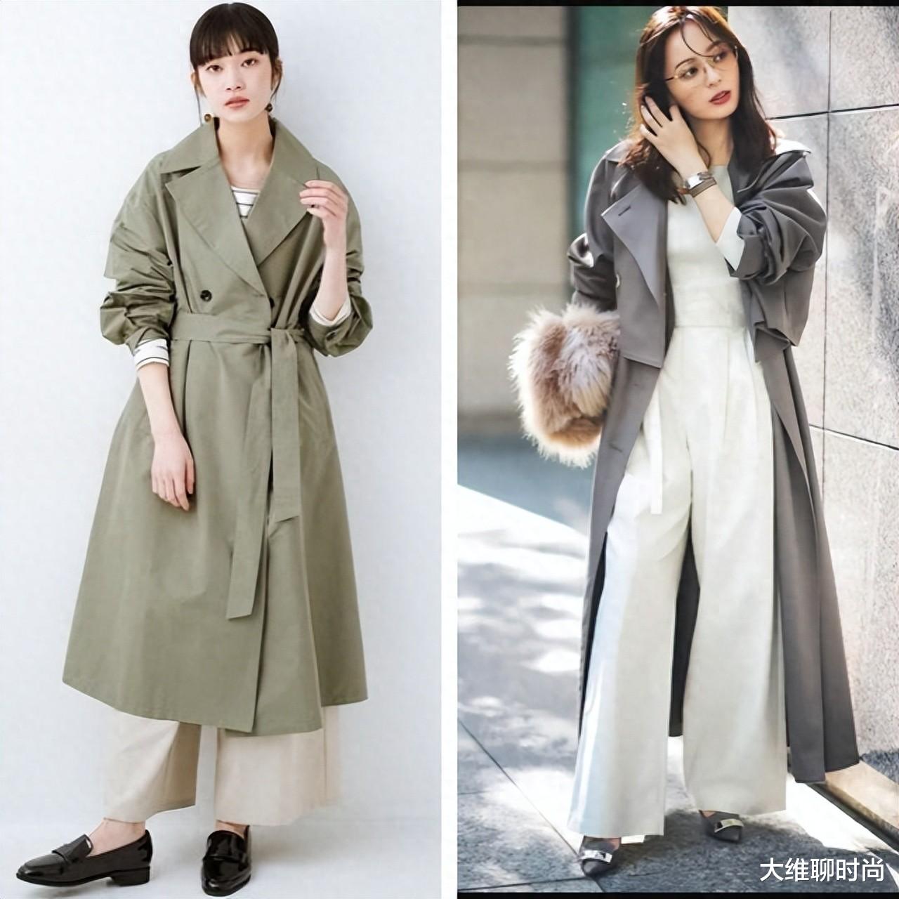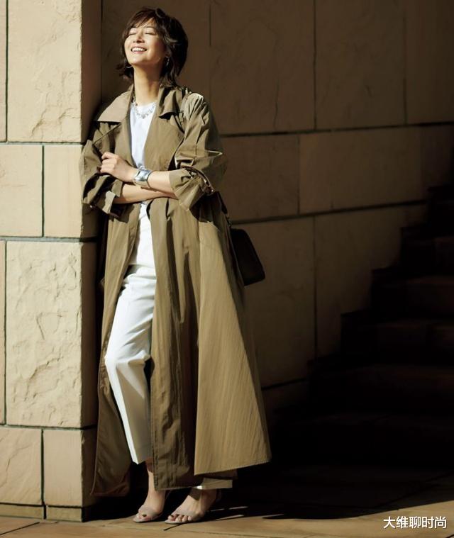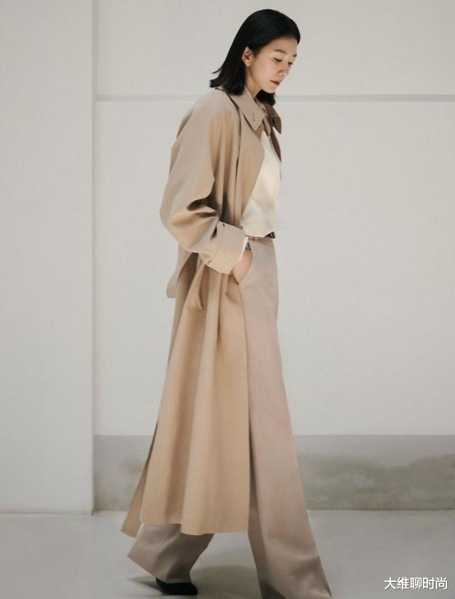 超长线条能在视觉上形成连贯的纵向延伸感,让人显得更为修长挺拔。它还能巧妙地隐藏腰臀部位的赘肉,无论内搭是修身的牛仔裤还是飘逸的阔腿裤,都能在风衣下摆的映衬下,只露出最纤细的脚踝,从而达到极佳的显瘦效果。
