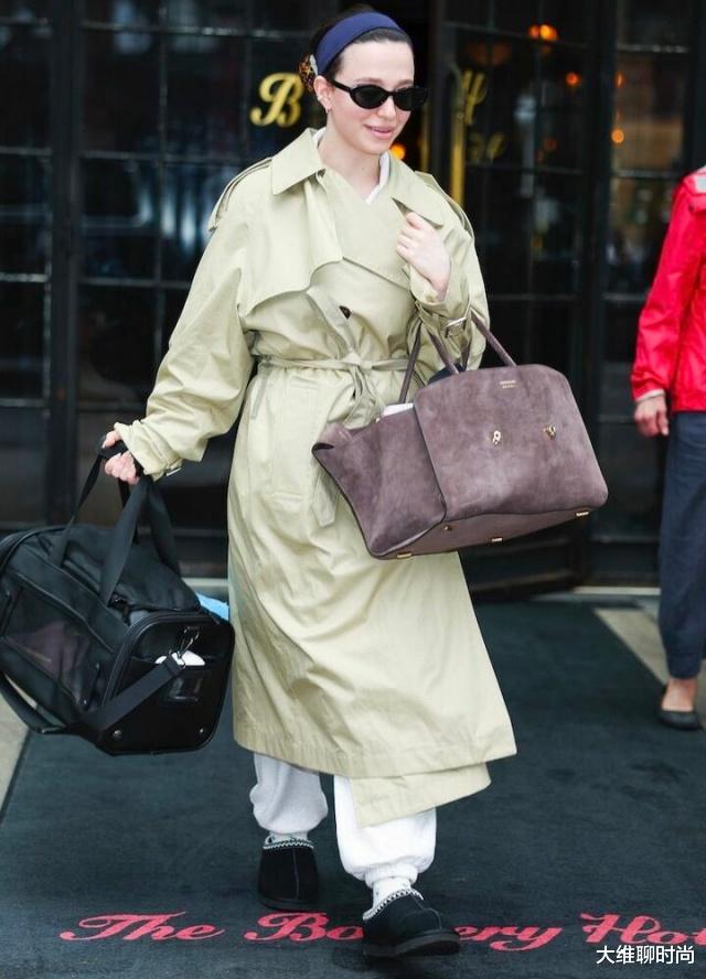2025年6月在纽约被街拍的麦基·麦迪逊(Mickey Madison)也以腰带收紧风衣的造型亮相。内搭白色上衣和运动裤营造松弛感,同时通过舒适穆勒鞋和发带的搭配实现慵懒氛围。得益于经典风衣与雅致棕色麂皮包的存在,整体绝不会显得邋遢随意。