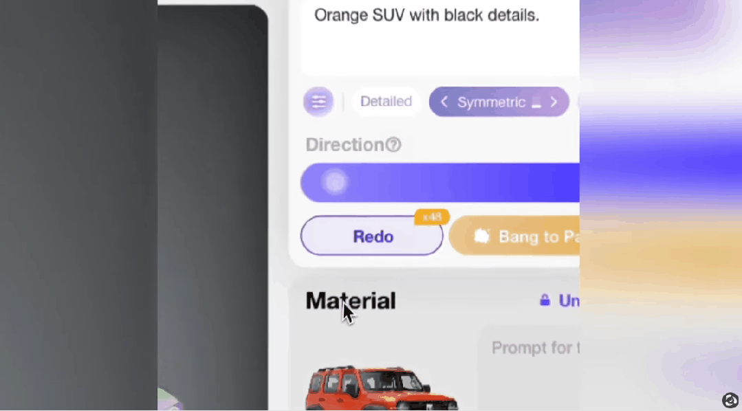而Hyper3D在去年10月推出的BANG功能,就可以让模型拆分成若干个部分。比如汽车模型,拆件之后会变成车身、车门、轮胎、悬挂等等零件,并且每一个部件都可以无限拆分。