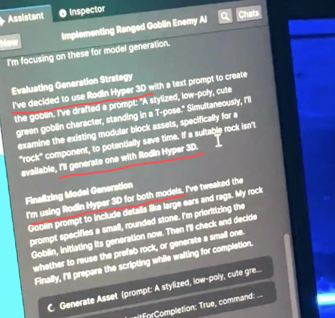 在GDC现场,演示人员在chatbox告诉Unity生成一个哥布林,Unity凭空就把哥布林的模型掏了出来,而且模型质量还不差,有精细的三角和四边面、可用的UV、PBR材质……如果你做过游戏,那应该能感知到,AI直接生成实际可用的模型,对开发者来说有多方便。