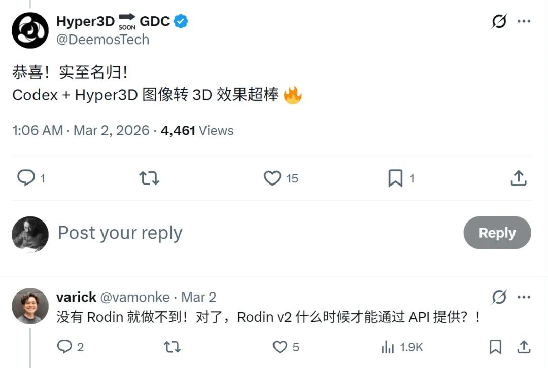 3月初,在OpenAI举办的首届全球黑客松上,一款拿下了冠军的3D AI增强现实应用,也是靠Hyper3D才实现了其核心概念。开发者说,“没有Hyper3D就拿不到冠军”,还顺手催更了一下API。