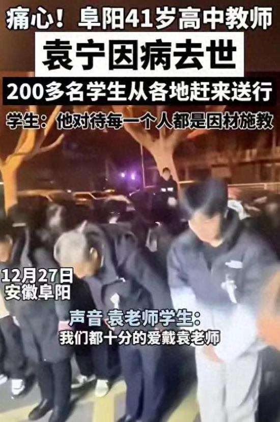 据了解,这名被200多名学生相送的老师是阜阳五中的体育老师袁宁老师,今年才41岁!