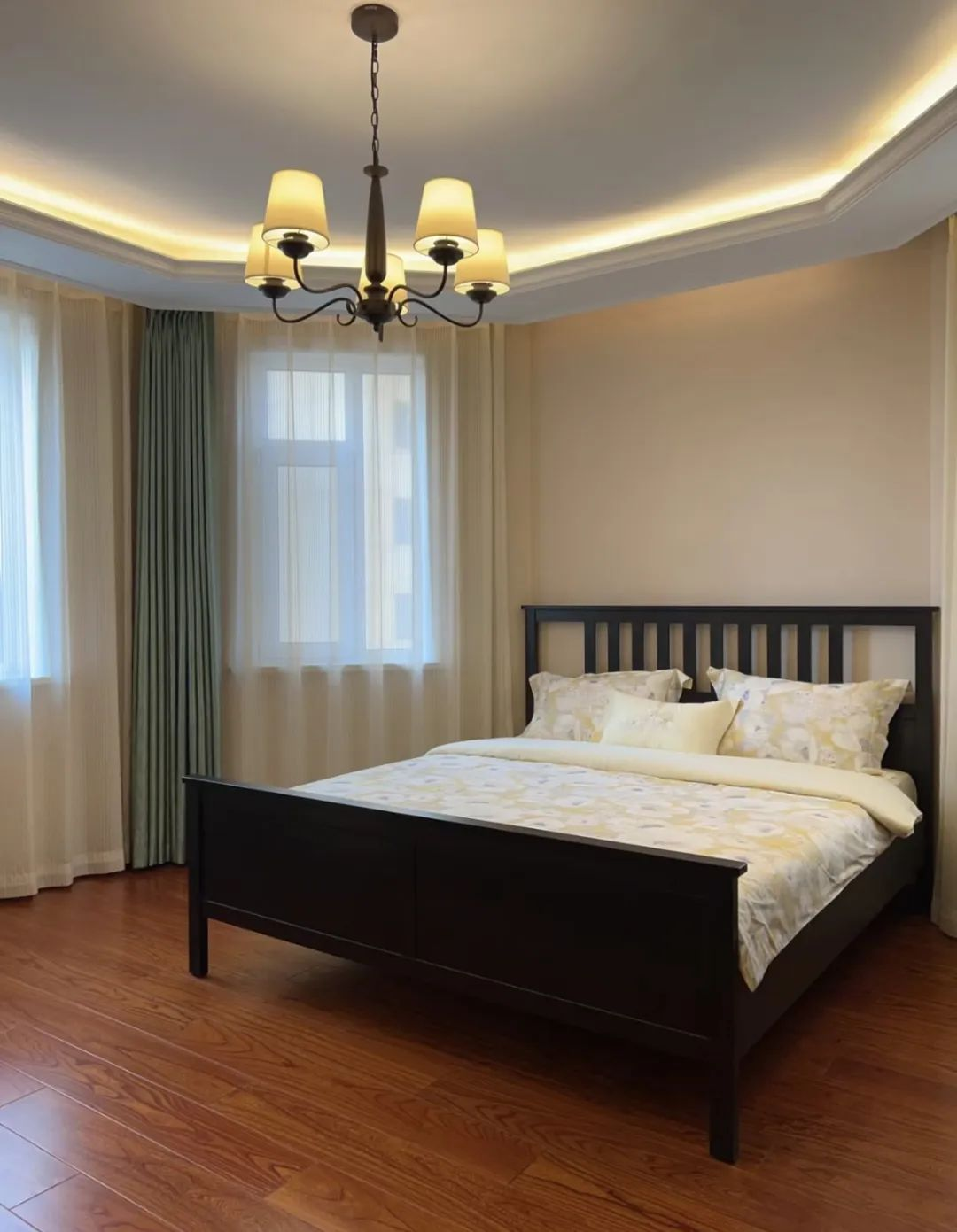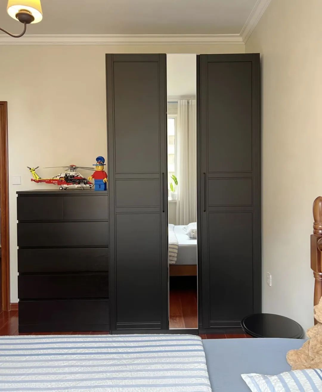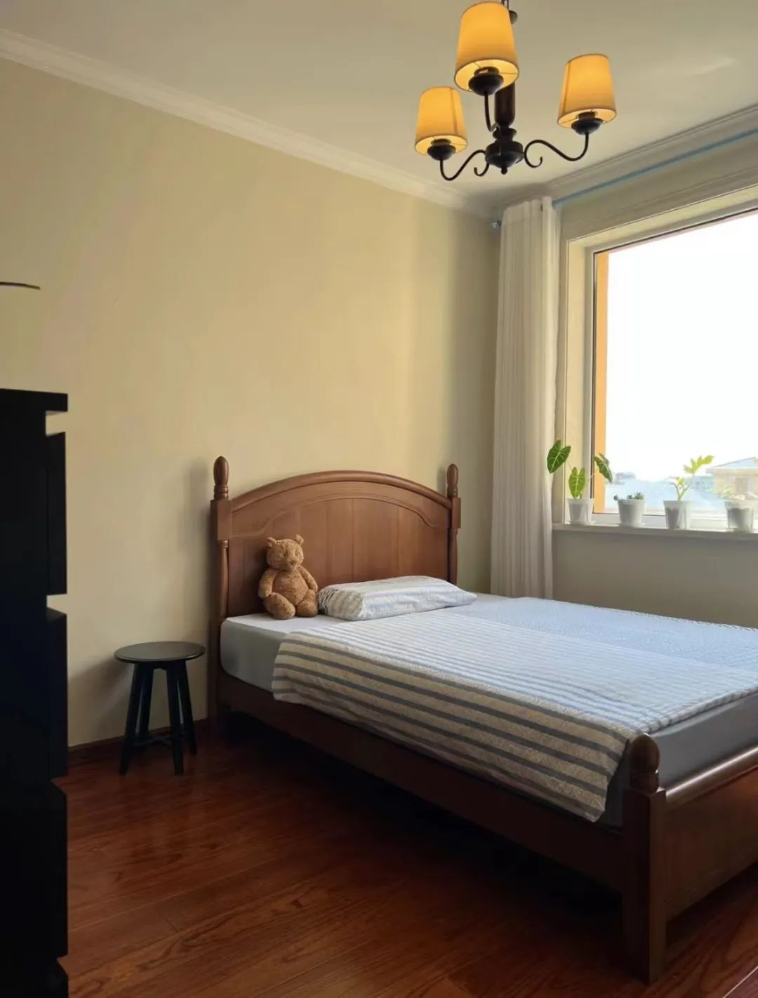 床头简洁的实木储物柜,则巧妙地收纳了日常所需的小物件,既方便又美观。