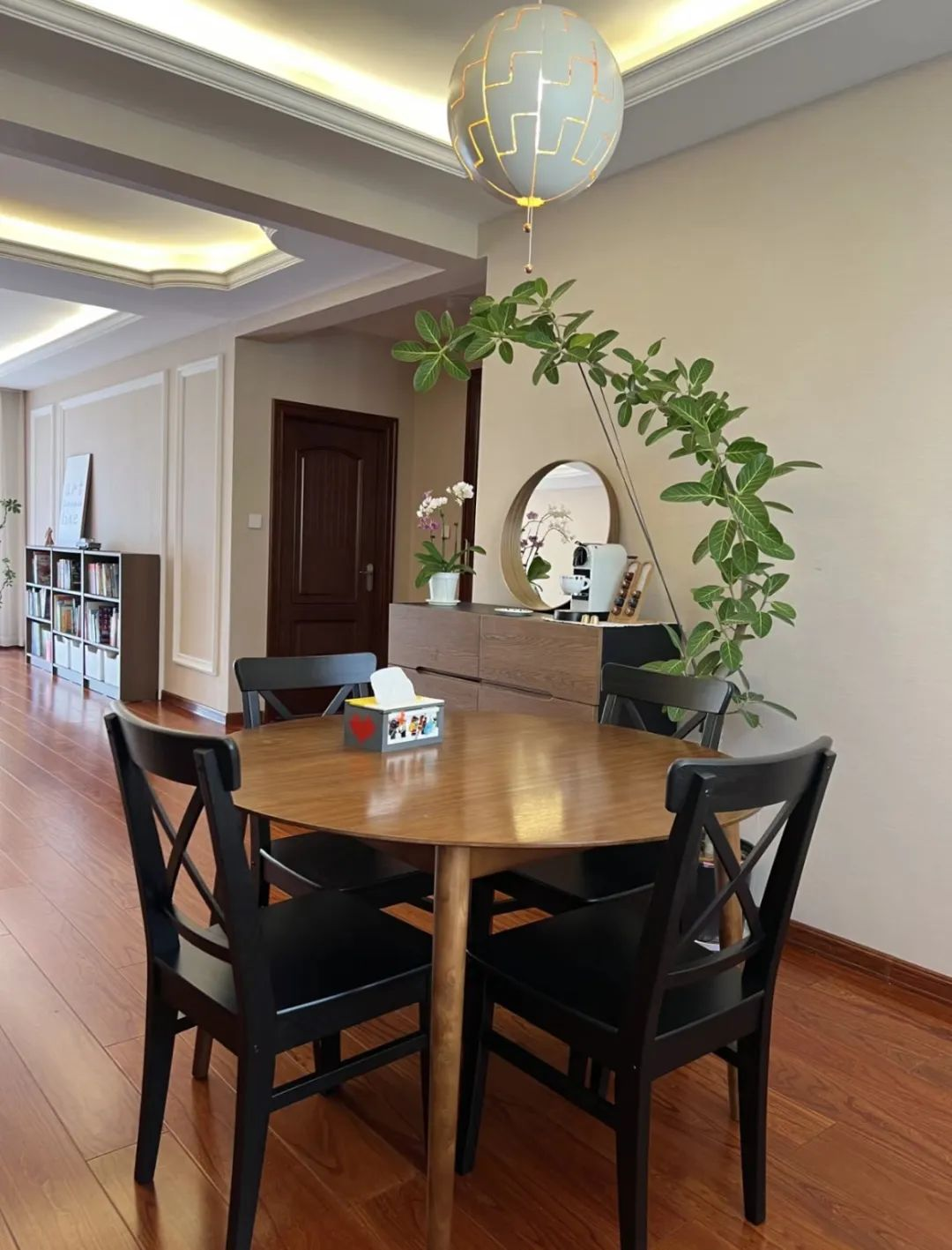 客厅以书柜代替电视柜的巧思令人赞叹不已,不仅提升了空间的文化氛围,也让家人的阅读习惯得到了更好的培养。