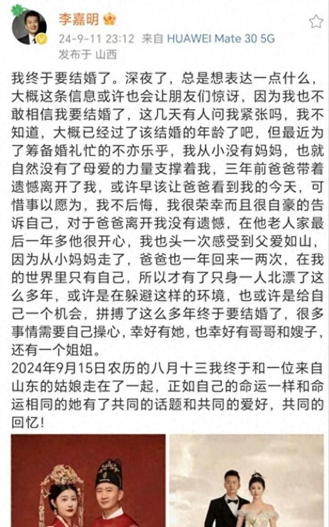 2024年9月27日,刚刚与李嘉明结婚12天的新婚妻子在社交网络上发布了这样一则动态,成功勾起了网友们的好奇心。