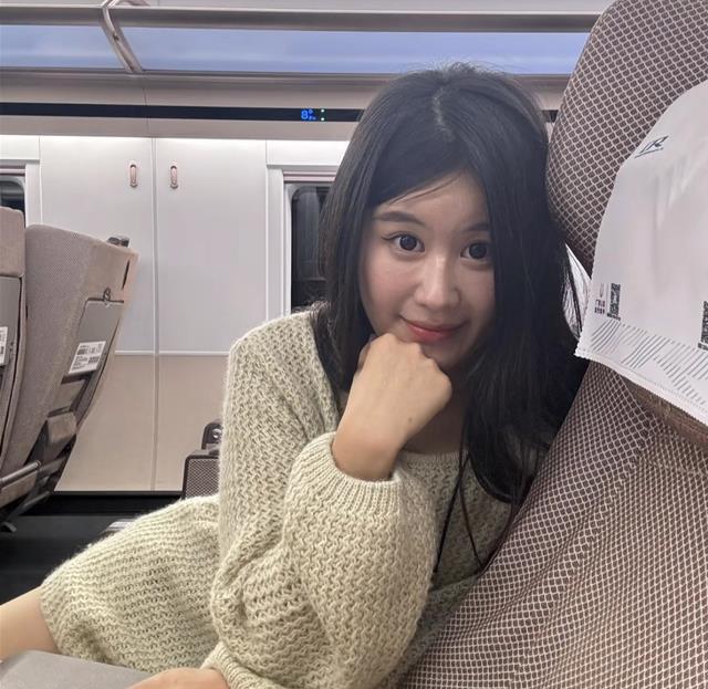 视频中,月月坐在列车上,不知道是不是要出门。
