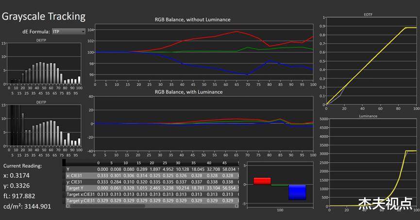 尽管SDR色准数据的反复让我们比较头疼,但是Q10M Ultra在HDR下的色准表现则相对稳定,平均De ITP在6以下,这是相当好的数据,我们在不同时间段测试这部分,数据差异不大,HDR的色彩表现堪称优秀。另外HDR的EOTF表现,不随白平衡的变化有什么区别,除了在暗部,实际亮度略低于信号亮度,其他时候都能准确跟随信号亮度,当然在峰值亮度之前依然会有一个微小的滚降来保持高光细节。