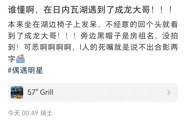 近日,有网友在瑞士的日内瓦湖偶遇成龙,一起同行的还有不少工作人员,还有一位金发年轻人,看起来像当地的导游各地翻译。