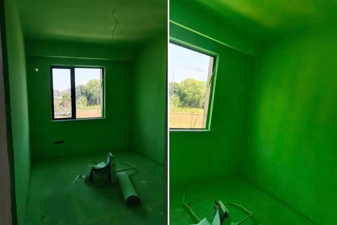 网友@芒种:我家儿童房选了浅浅的豆绿色墙漆,想着给孩子一个青春明亮的氛围,选色卡的时候也和设计师多次确定了,结果刷完以后就这个样子,阴森森的,邻居说都可以当绿幕或者拍恐怖片了。