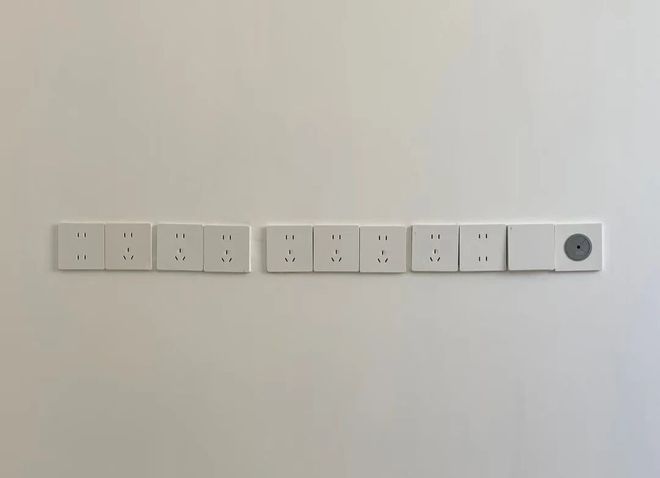 网友@小月儿:看看我家书房这一排插座,水电验收的时候没注意,装好以后就这个样子了,中间的缝我就不说了,这歪歪扭扭的是要干嘛,跳广场舞吗?