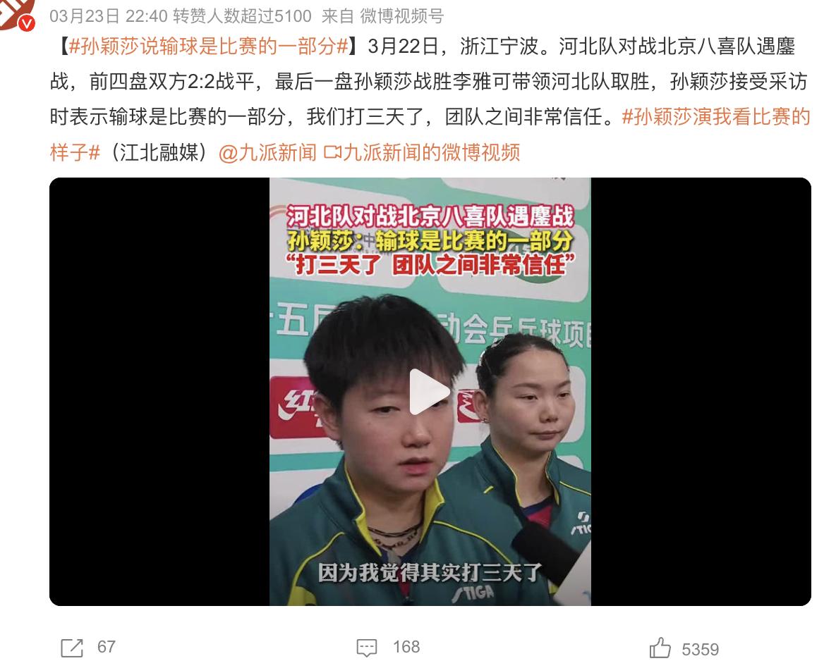 在这场比赛结束之后,在被记者询问到如何看待这场比赛队友输球的情况时,孙颖莎回应得非常真诚,她说不管是输球还是赢球本身都是比赛的一部分。很显然孙颖莎非常坦然看待比赛输赢,因为竞技体育其实就是这样,充满了不确定性而且没有人永远是常胜将军。所以应该要允许自己以及自己的队友在比赛场上遭遇输赢,只有这样才能够更加坦然看待比赛的结果,才可以拥有更好的状态保持更高的胜率。作为一位00后的年轻球员,孙颖莎有这样的心态其实是非常不错的。