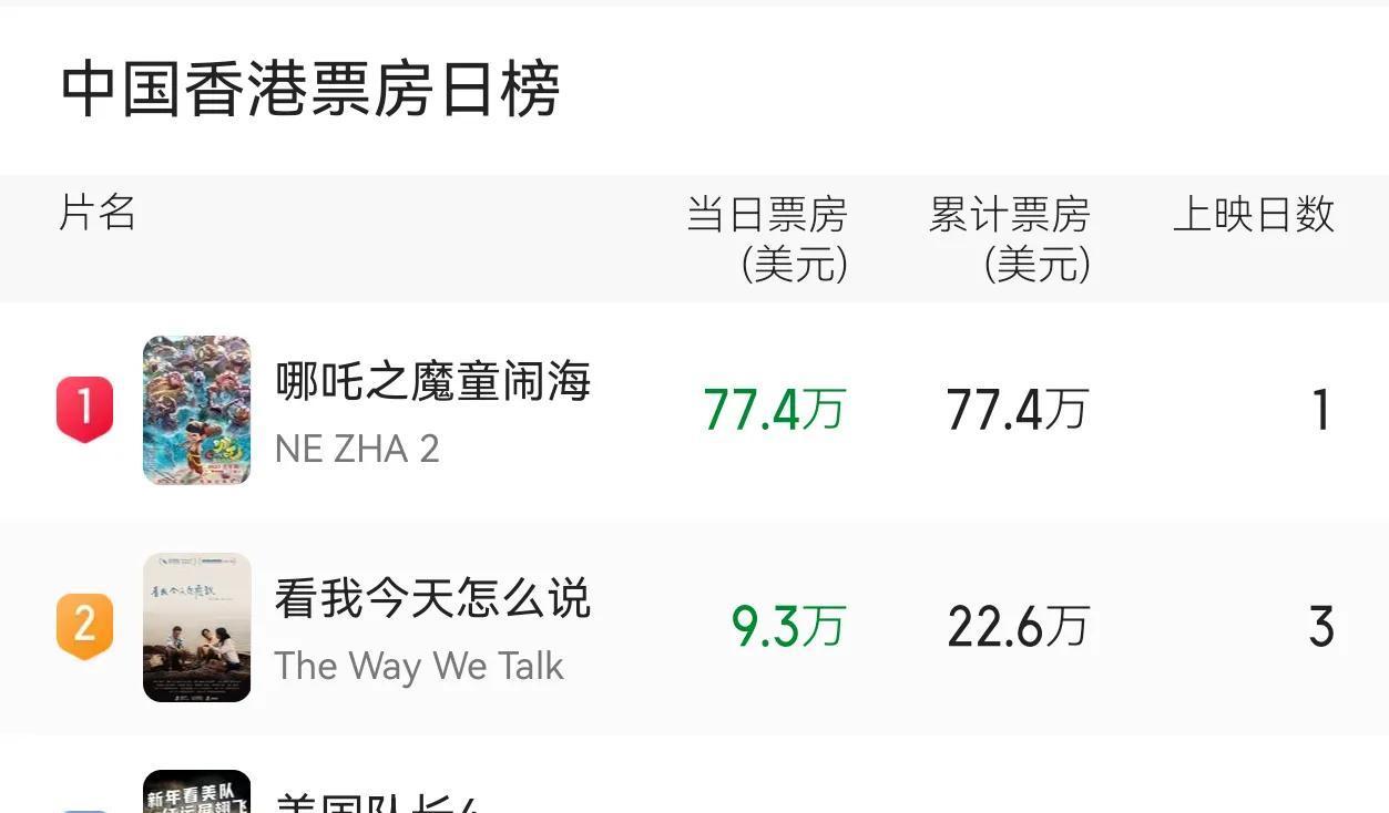 《哪吒2》在香港上映,首日票房直接干到了77.4万美元,把同期上映的《美国队长4》给压得抬不起头。