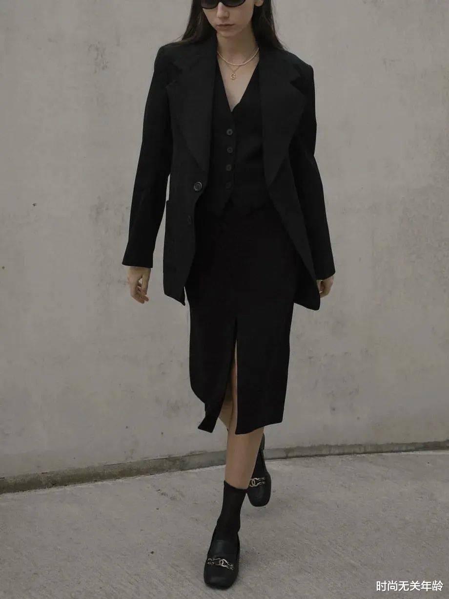 秋季,优雅的女人也可以选择黑色西装与连衣裙的叠穿,既保留了西装的干练利落,又融入了裙装的柔美飘逸。