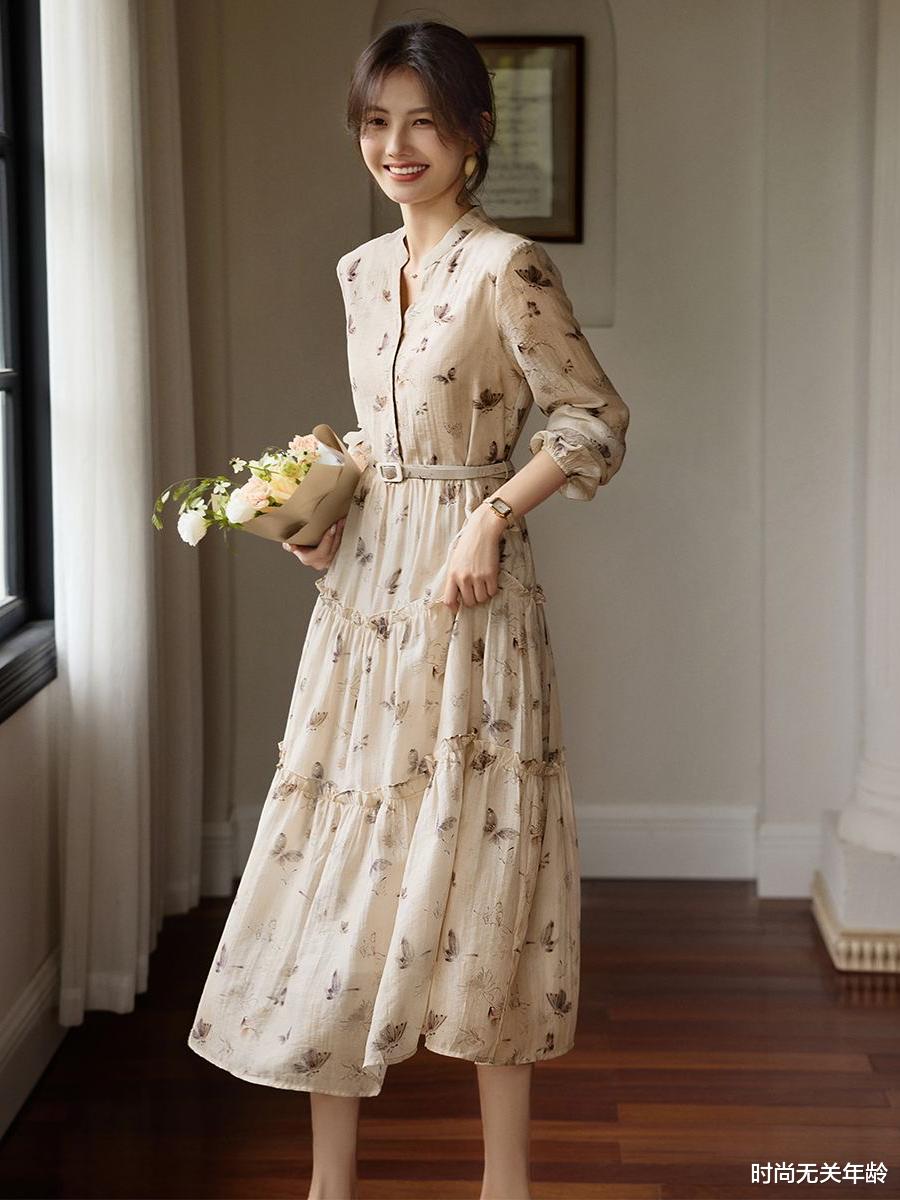 而水墨蝴蝶印花则诉说浪漫优雅多元的融合,纯粹的杏色温柔的同时又不乏时尚气息,与连衣裙的木耳边设计融合,完全符合有都市女性的时尚品味。