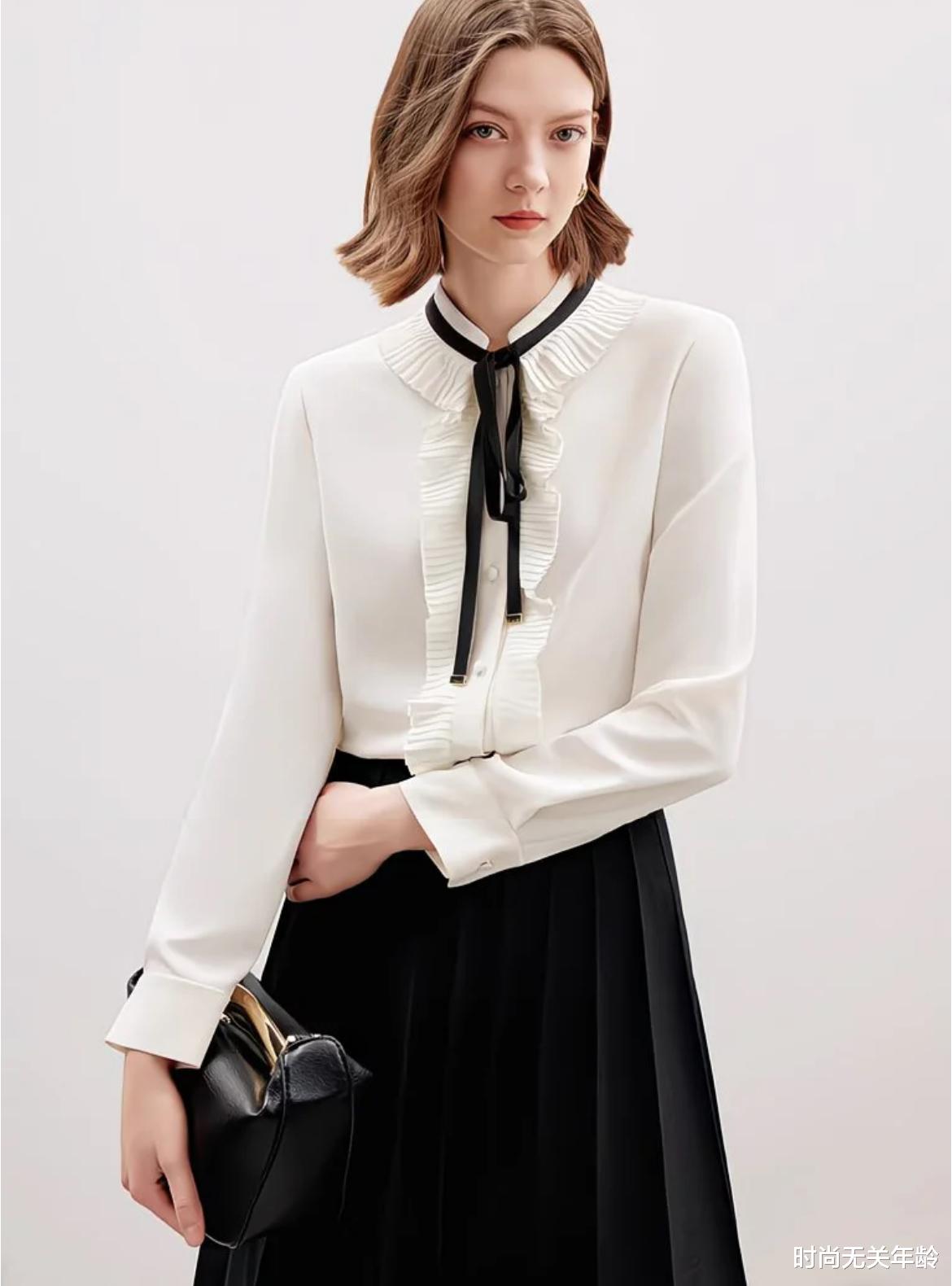 比如白衬衫,我们尤其要注意领口部位的设计感。像这种宫廷风设计的白衬衫就非常有辨识度,它会轻松成为视觉焦点,很好的衬托穿着者的气质。绝对有别于普通的职业装衬衫。