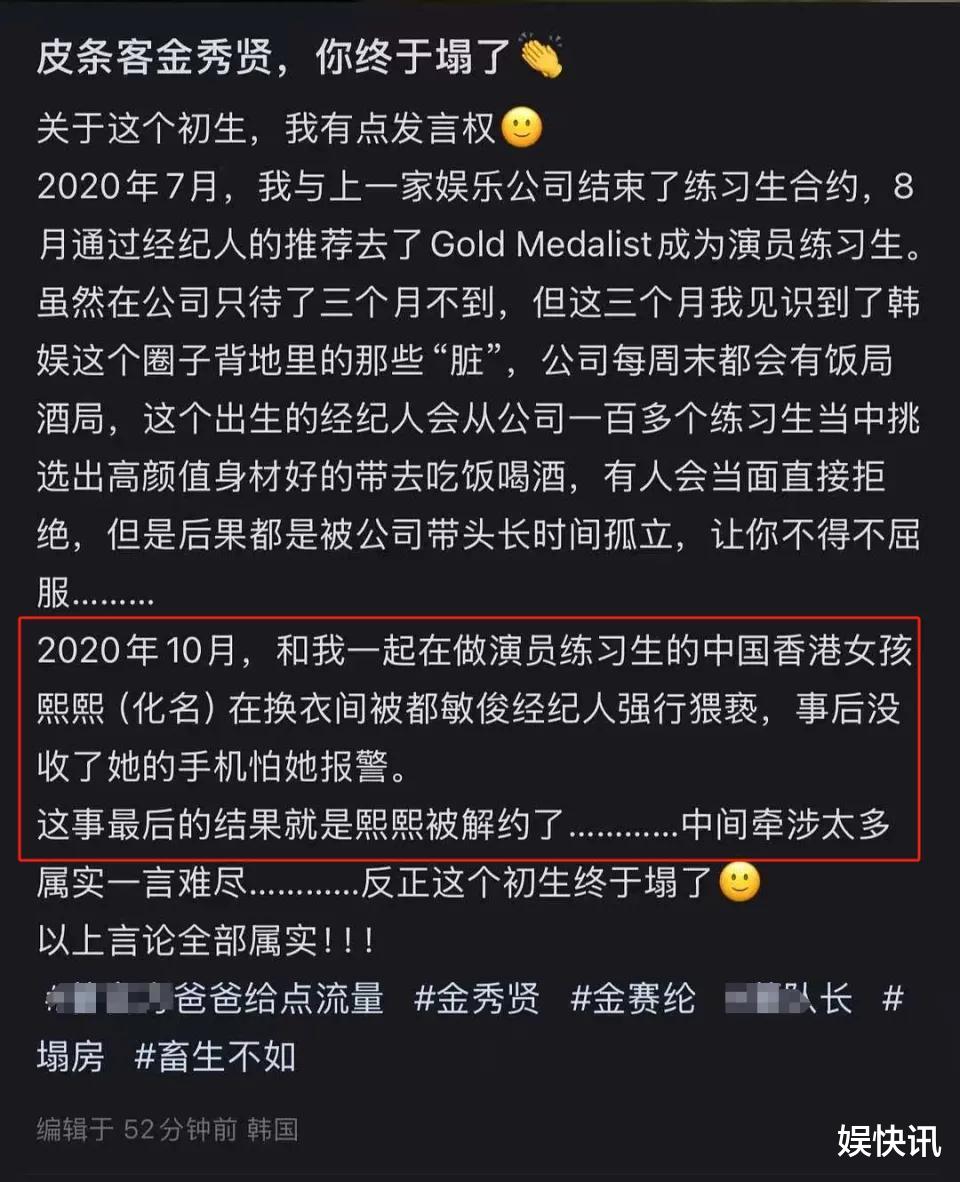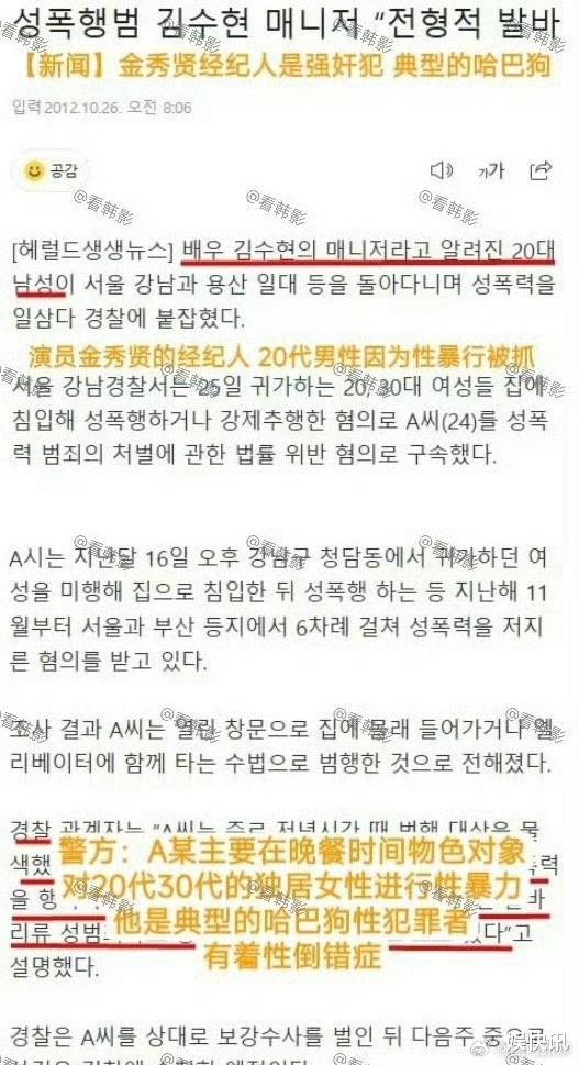 经纪人的性犯罪并非孤立事件。据韩媒报道,其性侵受害者年龄集中在20-30岁,作案地点包括首尔、釜山等地的公共场所,行为猖獗程度可见一斑。更恶劣的是,其利用经纪职权构建“潜规则”体系:要求练习生参与投资人饭局,拒绝者遭职场孤立,甚至直接对未成年练习生实施猥亵。曾经就有一名中国练习生控诉,2020年10月其在更衣室遭其侵犯,事后手机被没收以阻挠报警,最终被公司解约。这样可恶的行为最后却不了了之,就这样再一次的金秀贤经纪人为所欲为。