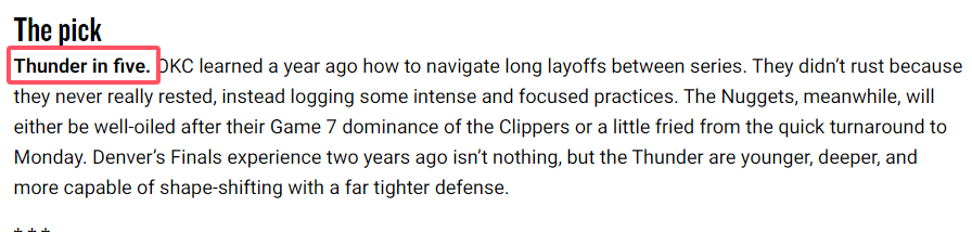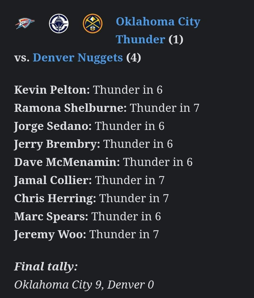 对于这一轮系列赛,NBA官网预测雷霆4-1淘汰掘金,ESPN专家团9人全都预测雷霆淘汰掘金——5人预测雷霆4-2掘金,4人预测雷霆4-3掘金。