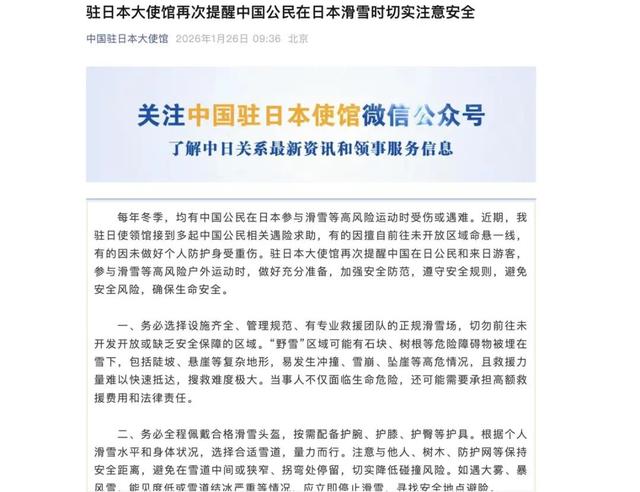 记者注意到,1月6日,中国驻日本大使馆曾发文提醒中国公民在日本滑雪注意安全。1月26日上午,中国驻日本大使馆再次提醒中国公民在日本滑雪时切实注意安全。据大使馆发文:每年冬季,均有中国公民在日本参与滑雪等高风险运动时受伤或遇难。近期,我驻日使领馆接到多起中国公民相关遇险求助,有的因擅自前往未开放区域命悬一线,有的因未做好个人防护身受重伤。驻日本大使馆再次提醒中国在日公民和来日游客,参与滑雪等高风险户外运动时,做好充分准备,加强安全防范,遵守安全规则,避免安全风险,确保生命安全。