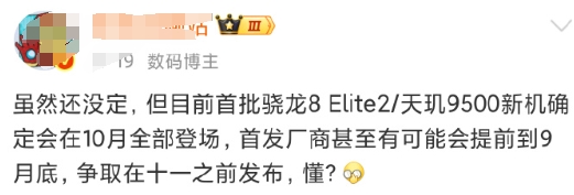 聊回新旗舰,从目前曝光的信息来看,高通的骁龙旗舰处理器今年再次提速,预计最早将在9月份发布,而首发厂商可能最早在9月底就会发布下一代旗舰。作为对比,2024年的骁龙8至尊版(Elite)的发布时间是10月22日,而小米15系列则是十月底发布的,也就是说今年的发布时间整整提前了一个月。
