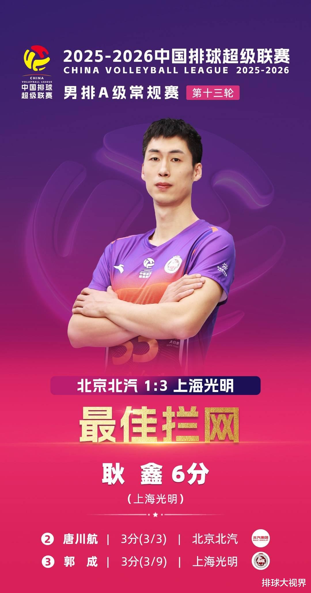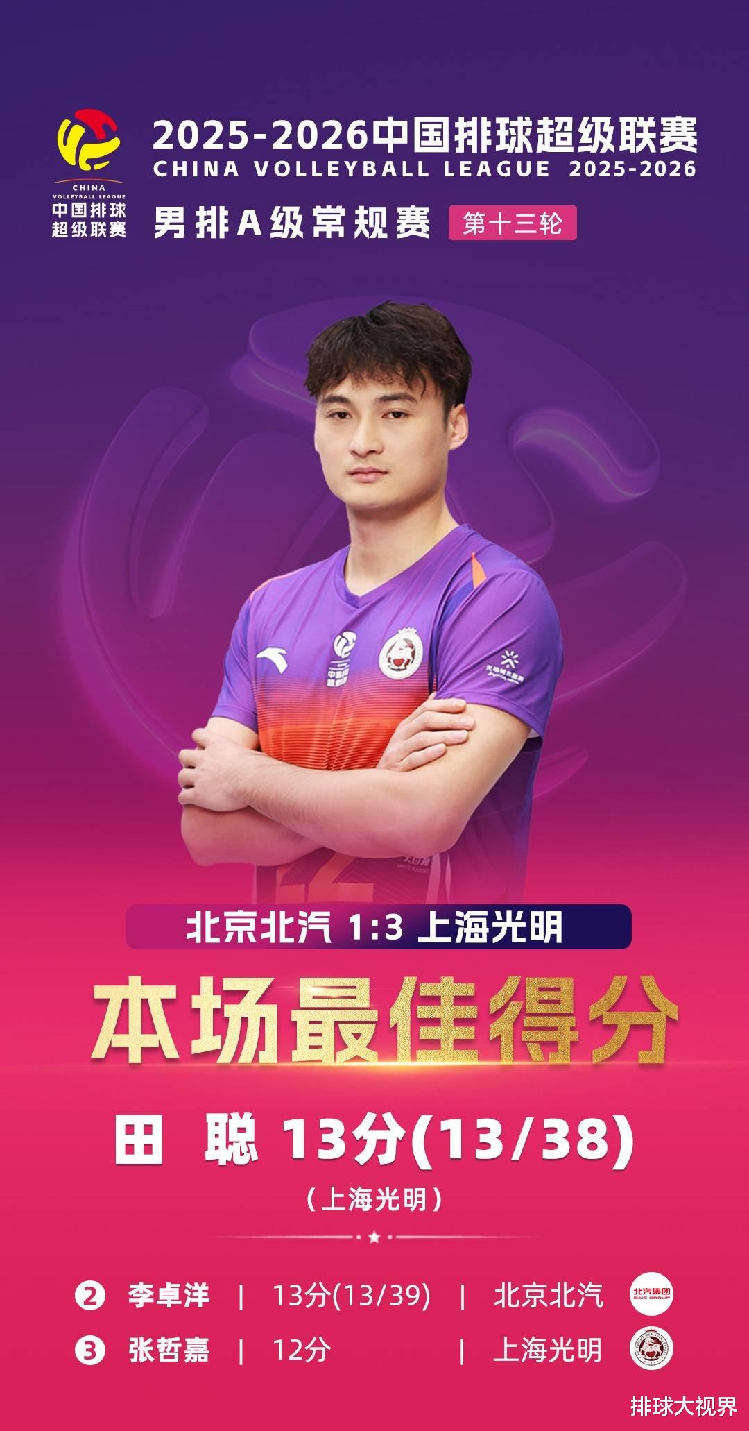 In the 13th round of the Men's Volleyball League, Beijing lost 1-3 to Shanghai at home. The scores of the four sets were: 25-19, 22-25, 21-25, 16-25. Li Zhuoyang scored 13 points, Deng Xinpeng 11 points, Zhang Binglong 11 points, Tian Cong 13 points, Zhang Zhejia 12 points, Wu Pengzhi 11 points, Wang Bohan 11 points, Geng Xin 11 points. Shanghai swept all the individual MVP awards!