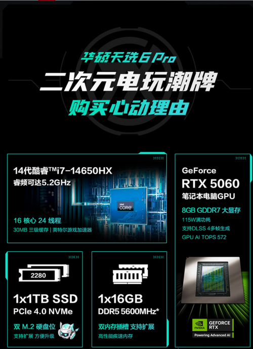 在当前移动办公与多任务处理日益增长的需求下,多核性能强劲的游戏本正成为兼顾生产力与娱乐的热门选择。2026年初,华硕旗下的“二次元电玩潮牌”天选系列 再次进入大众视野,其新款天选6 Pro酷睿版凭借多核性能、出色扩展性与相对轻薄的机身,成为市场上引人注目的选项。本文将以推荐配置为例,对其进行深度解析。