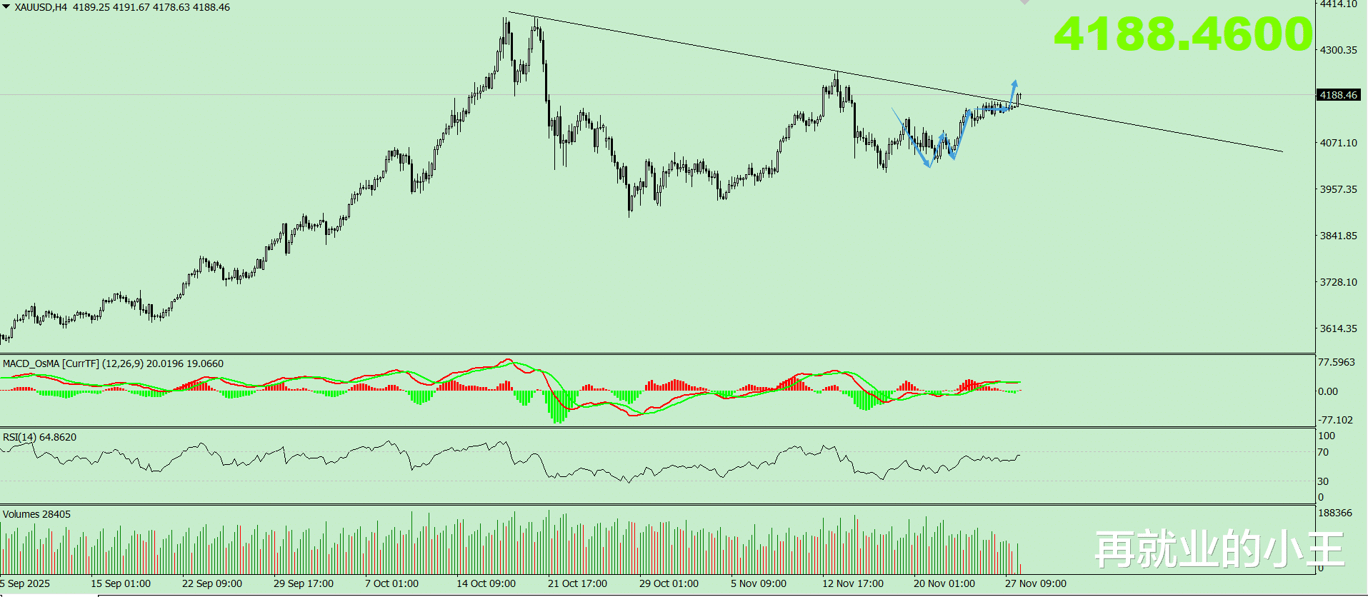 隔夜,黄金保持在高位震荡运行,黄金在走出了4小时底部之后开始上行,上行测试到4381-4245的下行趋势线遇阻,昨天全天都保持在趋势线附近震荡运行。
