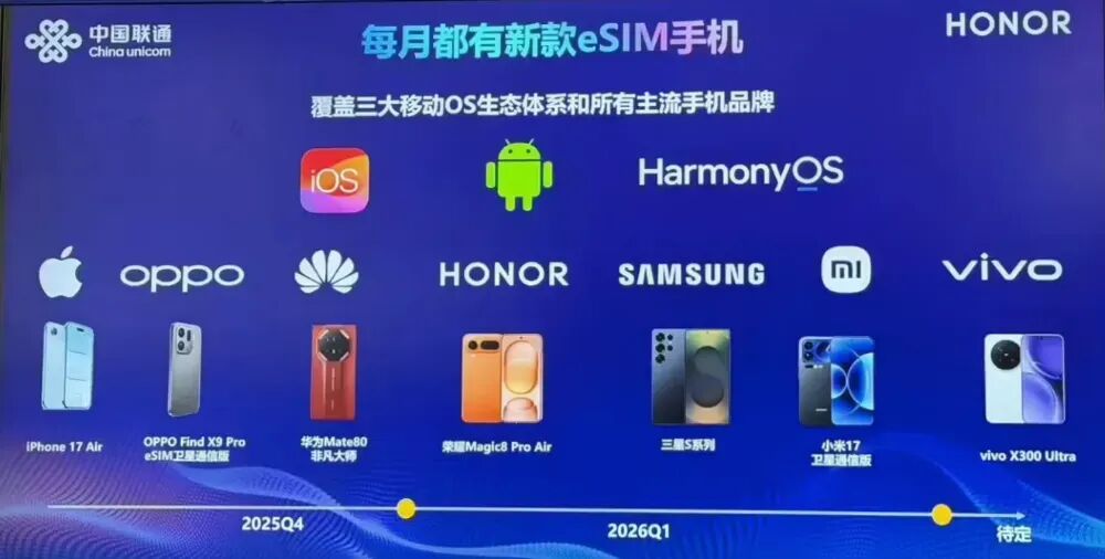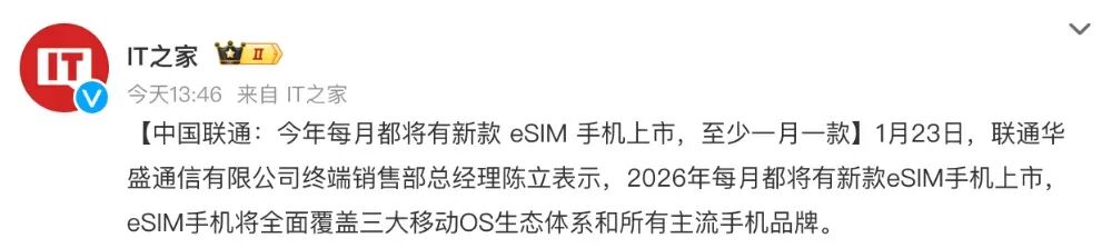 参数IT之家的报道来看,“联通华盛通信有限公司终端销售部总经理陈立表示,2026年每月都将有新款eSIM手机上市,eSIM手机将全面覆盖三大移动OS生态体系和所有主流手机品牌。”