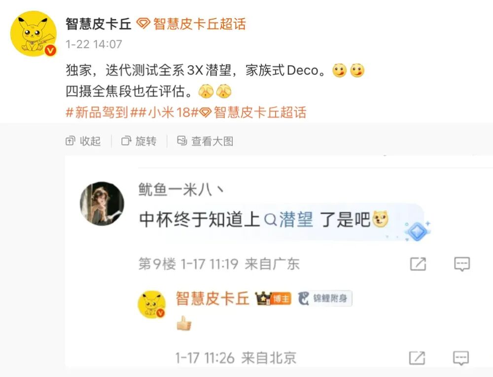同时,博主@智慧皮卡丘 的一份爆料中提到,“迭代测试全系3X潜望,家族式Deco。四摄全焦段也在评估。”