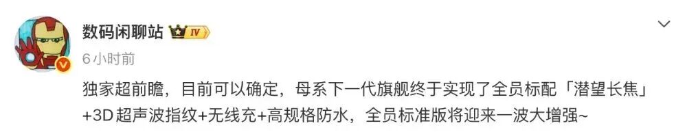 在此之前,博主@数码闲聊站 的一份消息中也提到过,“独家超前瞻,目前可以确定,母系下一代旗舰终于实现了全员标配「潜望长焦」+3D超声波指纹+无线充+高规格防水,全员标准版将迎来一波大增强~”