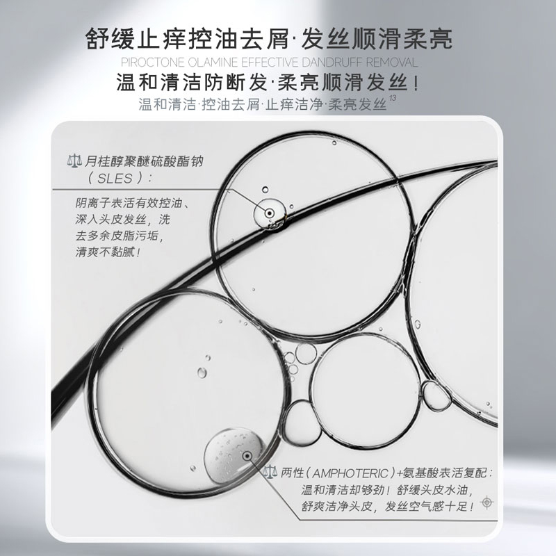 清洁基底:采用月桂醇聚醚硫酸酯钠(SLES)+椰油酰胺丙基甜菜碱(CAB)+癸基葡糖苷(APG) 的复配表活体系。SLES提供主清洁力,CAB与温和非离子表活APG有效缓冲刺激,确保在高效清除头皮多余油脂与污垢的同时,避免过度脱脂导致头皮干涩、屏障受损。配方pH值维持在5.5-5.8,贴合头皮生理弱酸环境。
