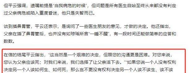 她坚持丈夫“自然死亡”的遗愿,却在与继子女的治疗争议中败下阵来,眼见平鑫涛在插管治疗中“痛苦存活”,她陷入了深深的愧疚和矛盾。她说:“我的丈夫走了,我也失去了我自己。”这不是矫情,而是一种生命不可承受之重。