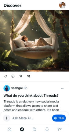 在应用中,有专门的“发现”页面。这个页面既可以通过点击底部菜单进入,也可以在首页下拉进入。Meta对这块毕竟是熟手了,社区里发帖、转评赞一应俱全,且可以分享到站外。用户可以将和Meta AI的互动内容分享到社区,其他用户还可以一键使用同款。