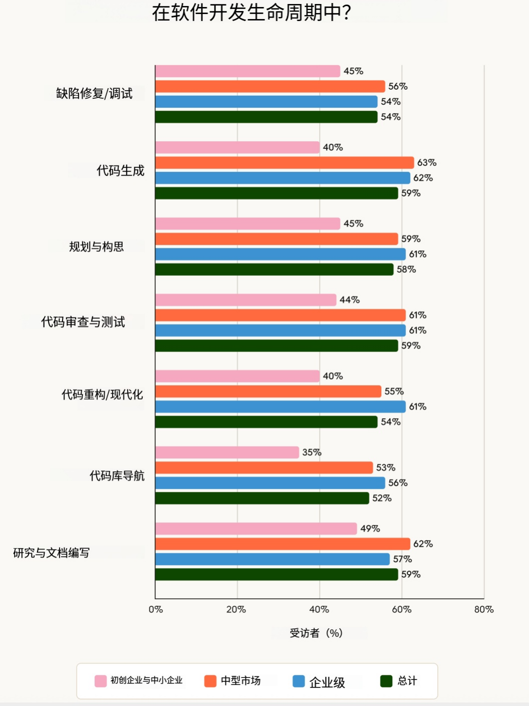 各组织报告称,人工智能智能体在整个开发生命周期中节省了更多时间 —— 从规划和构思阶段(占 58%)到代码生成、文档编写、测试和审查阶段(均占 59%)。